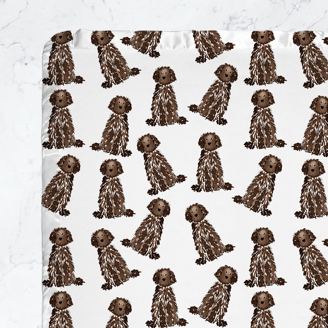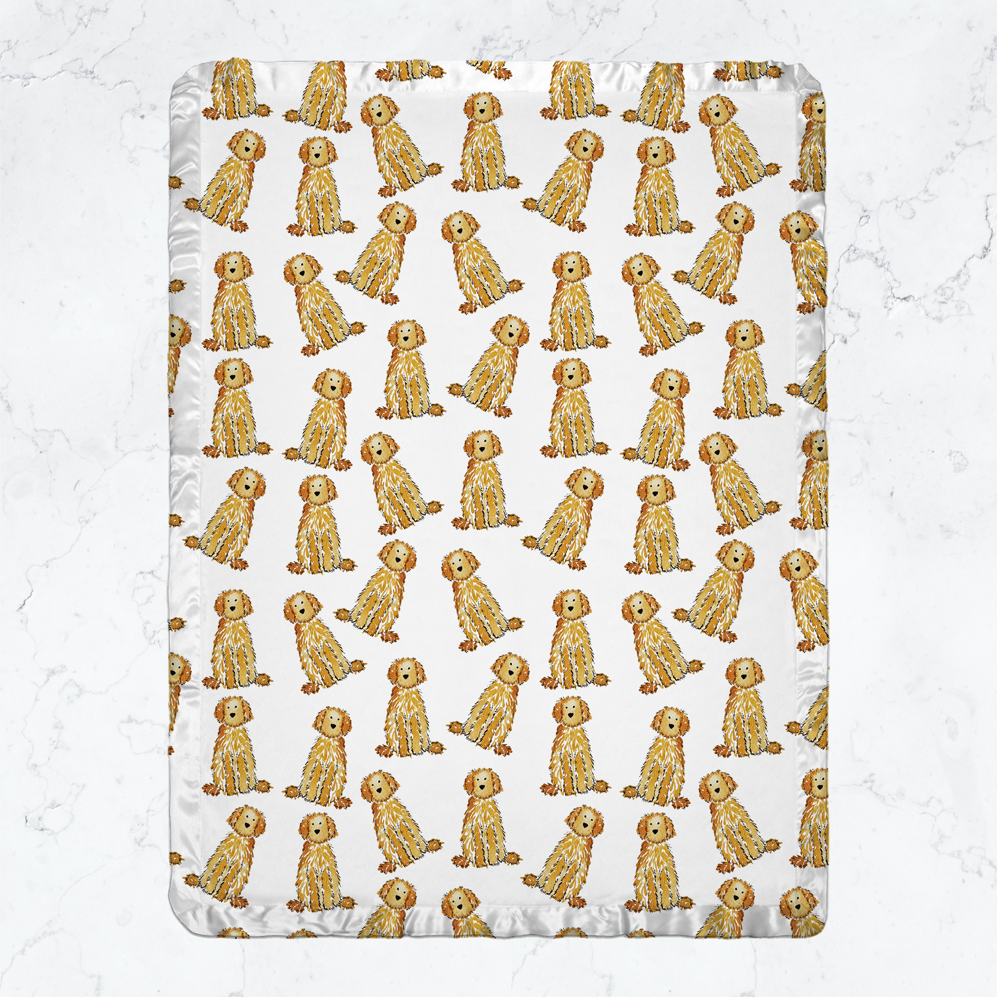 Snuggle up with this satin-trimmed minky baby blanket featuring a playful pattern of Standard Doodles! This ultra-soft blanket makes the perfect baby shower gift, new baby present, or cozy nursery addition for any doodle-loving family. Designed with a whimsical pattern of Standard Doodles in popular coat colors—Apricot, Cream, Black, Bernedoodle, and Brown—it celebrates all the charm of Goldendoodles, Bernedoodles, Aussiedoodles, and Labradoodles.