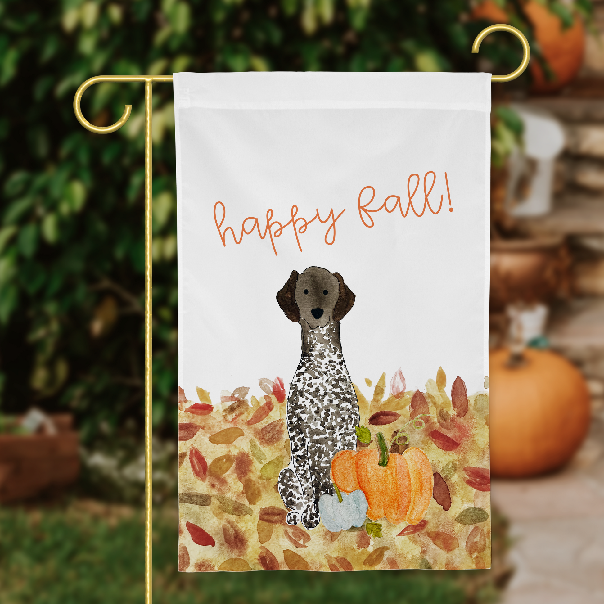 Greet autumn & visitors with a festive fall German Shorthaired Pointer garden flag! 🍂 This flag's handpainted watercolor art will lend a playful, unique vibe to your home. Choose from a selection of coat colors to find a GSP that looks just like yours. The pumpkins & leaves make this flag perfect for the fall season—it's a breeze to switch it out with the seasons. 🎃🍁