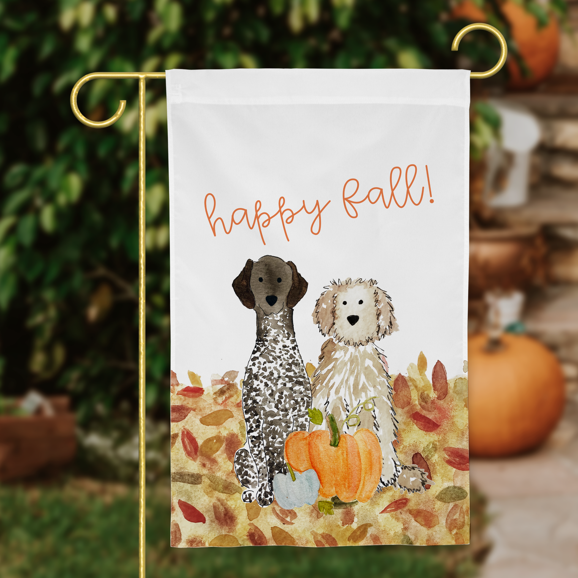 Greet autumn & visitors with a festive fall garden flag adorned with your pups! ๐ This flag's handpainted watercolor art will lend a playful, unique vibe to your home. Choose from a selection of breeds to find pups that looks just like yours. The pumpkins & leaves make this flag perfect for the fall seasonโit's a breeze to switch it out with the seasons. ๐๐