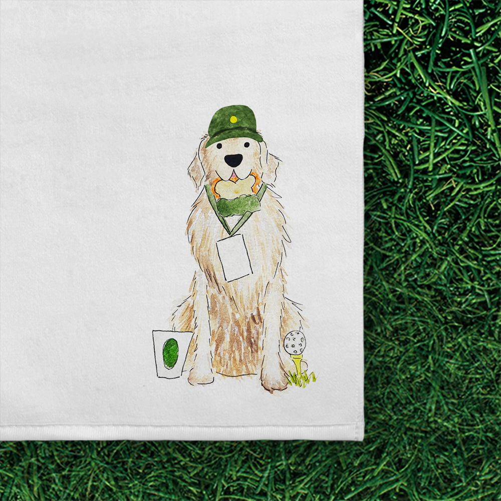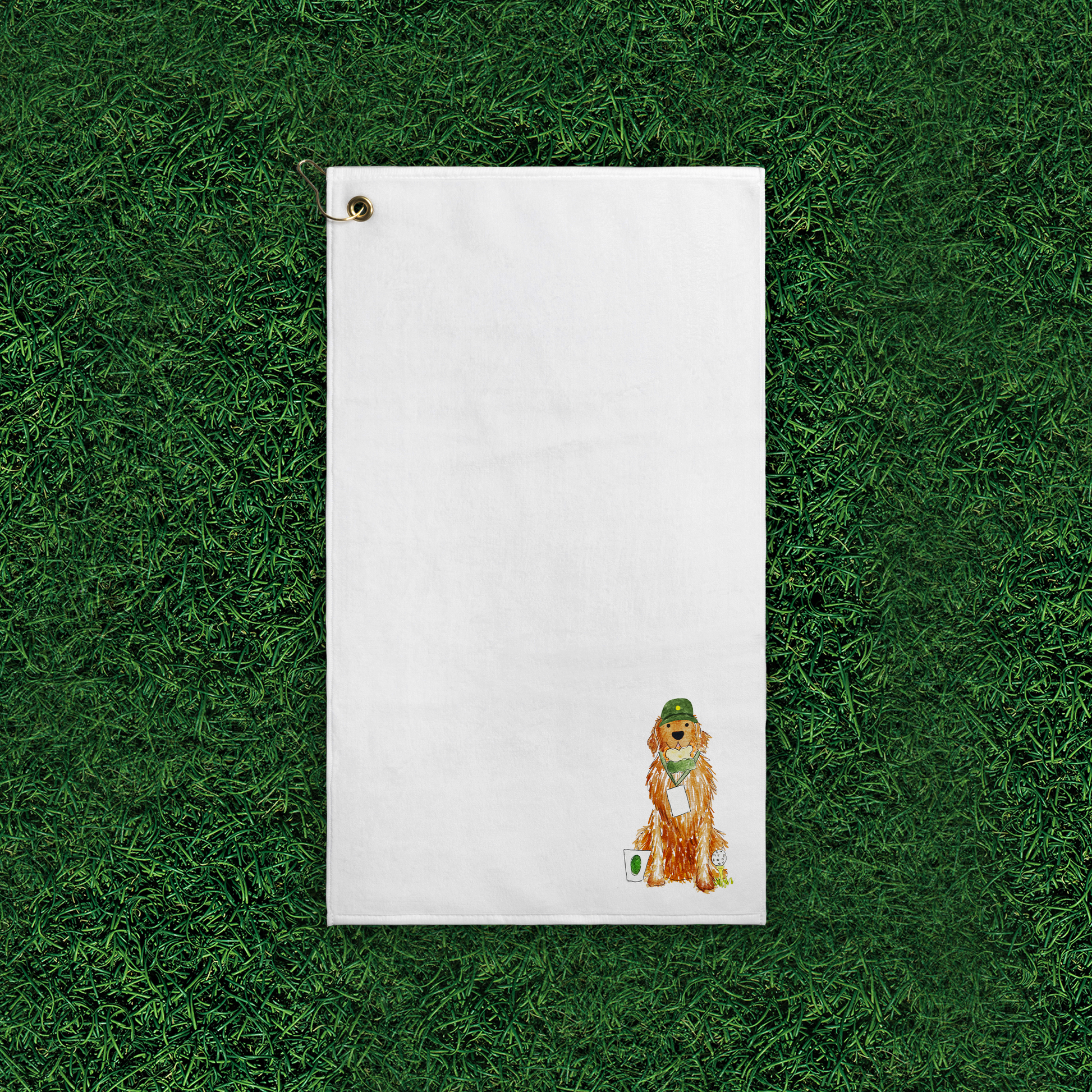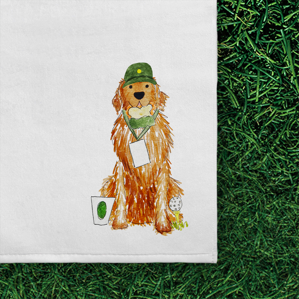Elevate your golf game with this golden retriever golf towel! This premium golf towel features original watercolor art of a light Golden Retriever dressed for a day at a spring golf tournament, complete with a green cap, lanyard badge, golf tee, souvenir drink cup, and a pimento cheese sandwich. Pick from different Golden Retriever colors for a pup that matches yours: Golden Retriever, English Cream Golden Retriever (or light golden retriever), and Red Golden Retriever