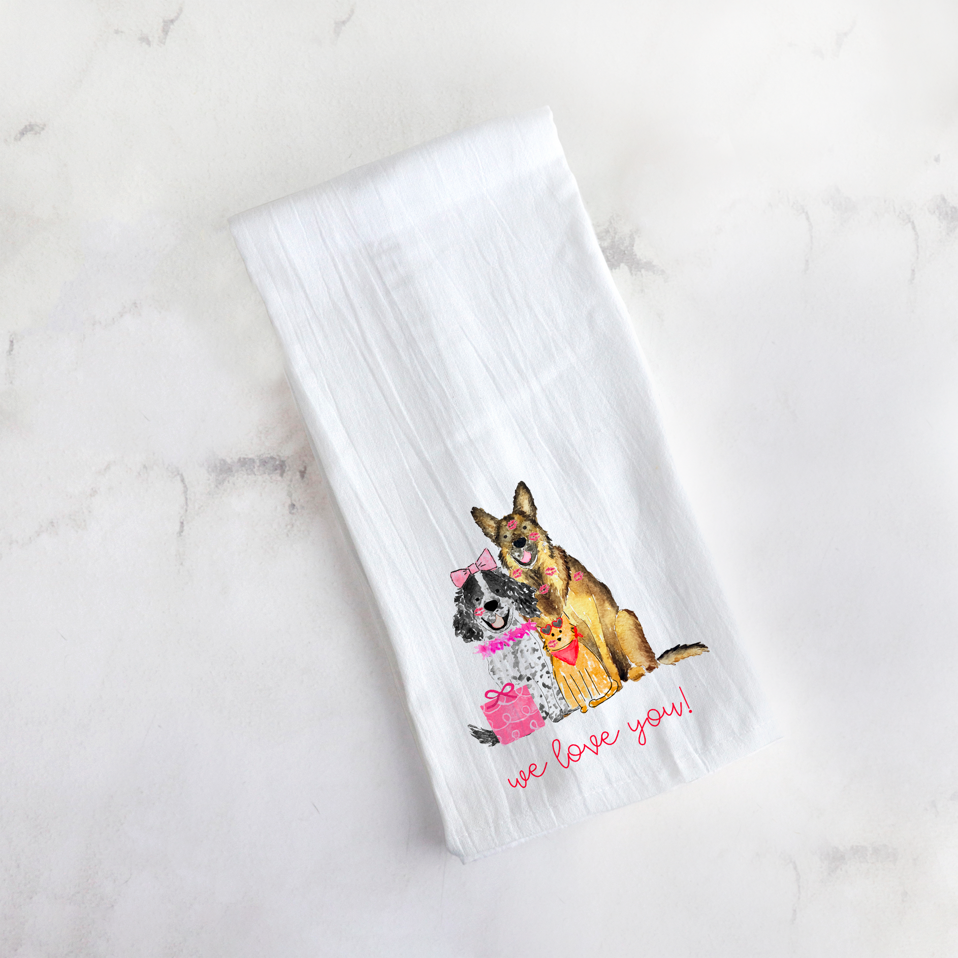 Get your kitchens and bathrooms ready for Valentine's Day with a tea towel personalized with your furry family! Customize your towel with hand-painted watercolor art of your adorable pets and your choice of seasonal accessories. Personalize with 1-5 pets! The more the merrier!