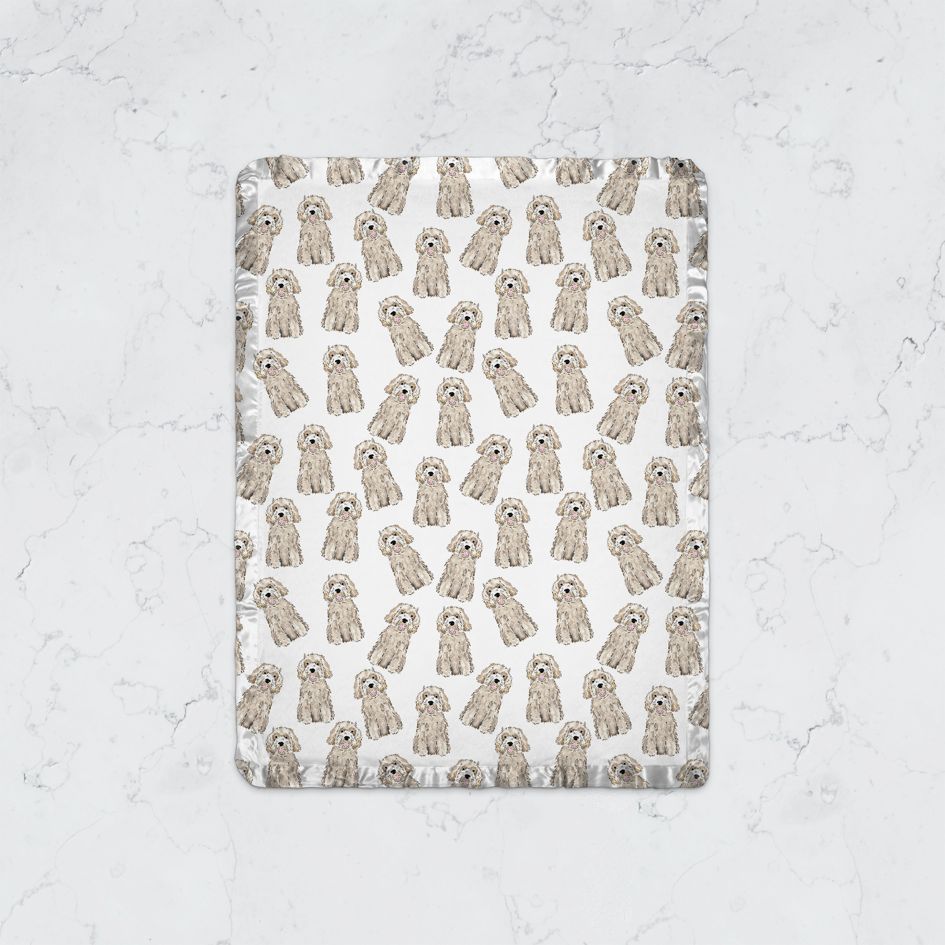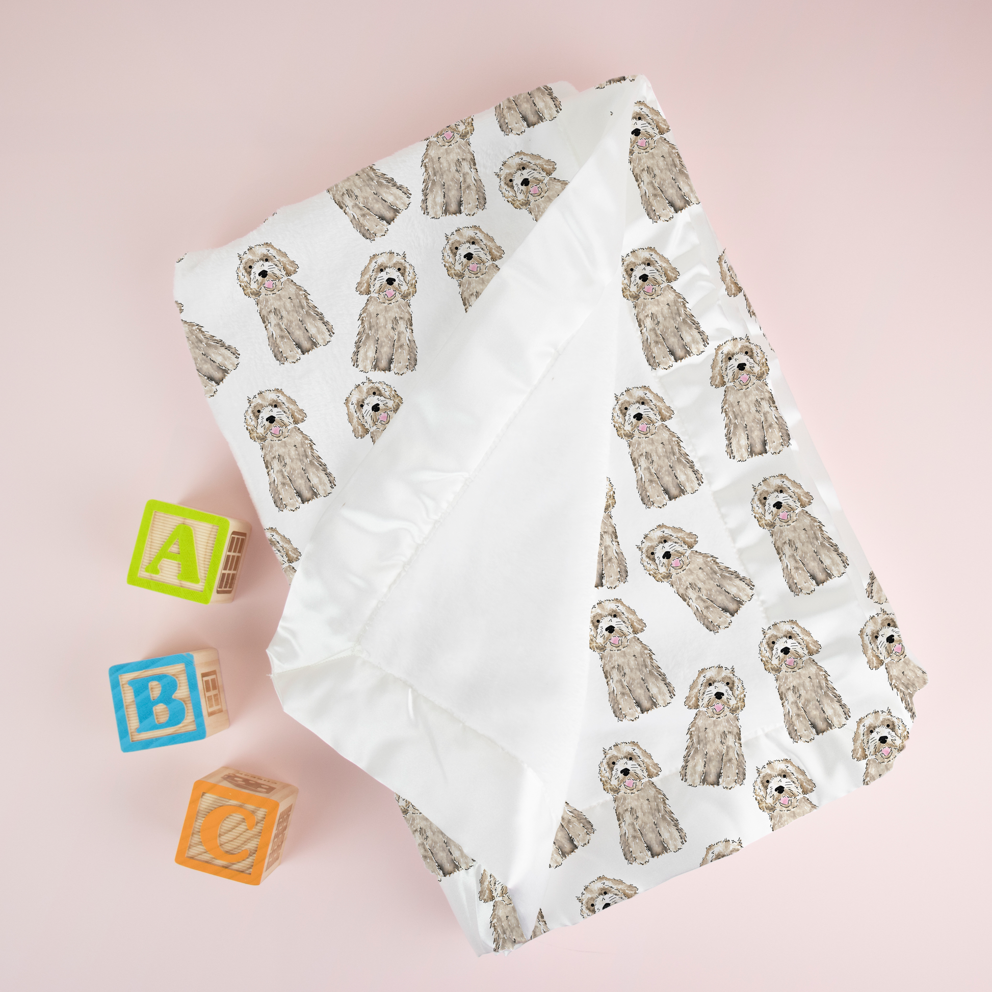 Wrap your little one in cozy comfort with our satin-trimmed minky baby blanket, featuring a charming pattern of Mini Doodles! Perfect for baby showers, new baby gifts, or bringing your doodle love into the nursery, this ultra-soft blanket showcases adorable Mini Doodles in a variety of popular coat colors—Apricot, Cream, Black, Apricot and Cream, and Black and White. Whether you're shopping for a Goldendoodle, Bernedoodle, Aussiedoodle, or Labradoodle lover, this doodle baby blanket makes a thoughtful and personal gift.