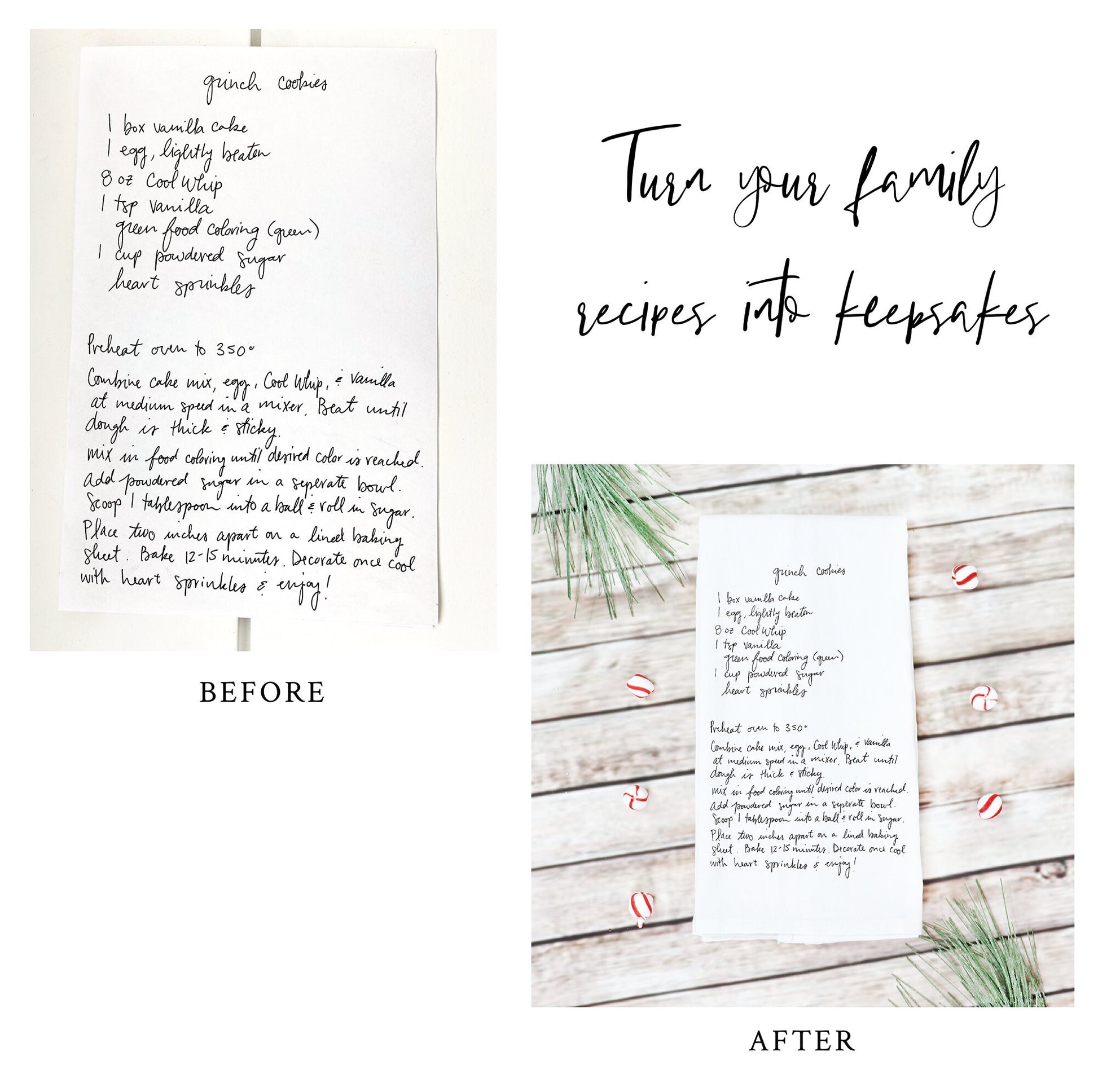 Turn your favorite handwritten family recipes into a beautiful tea towel! A great keepsake gift to enjoy for years!