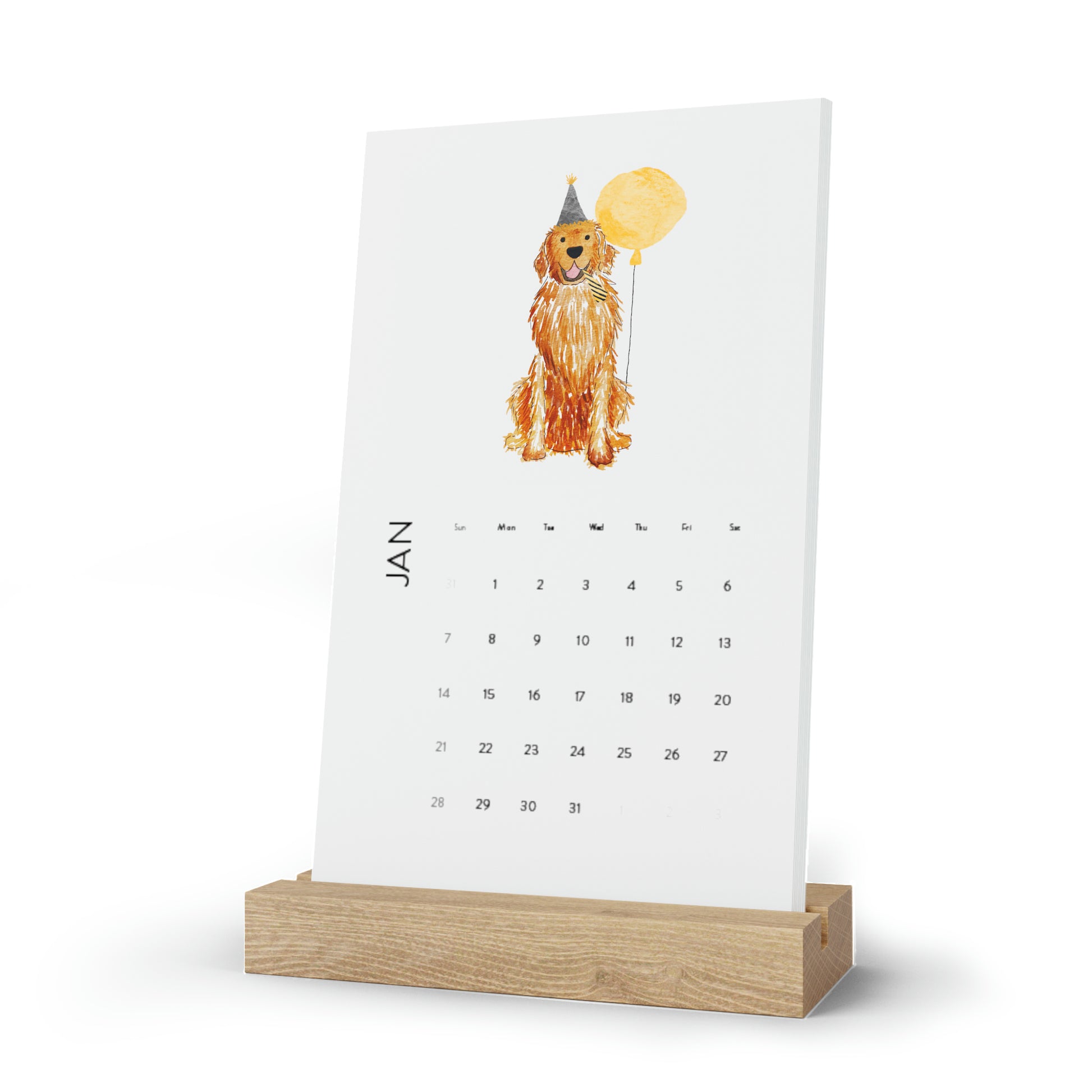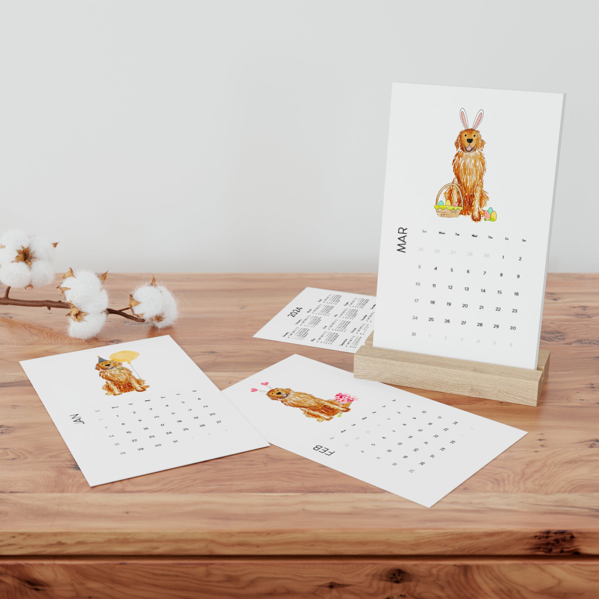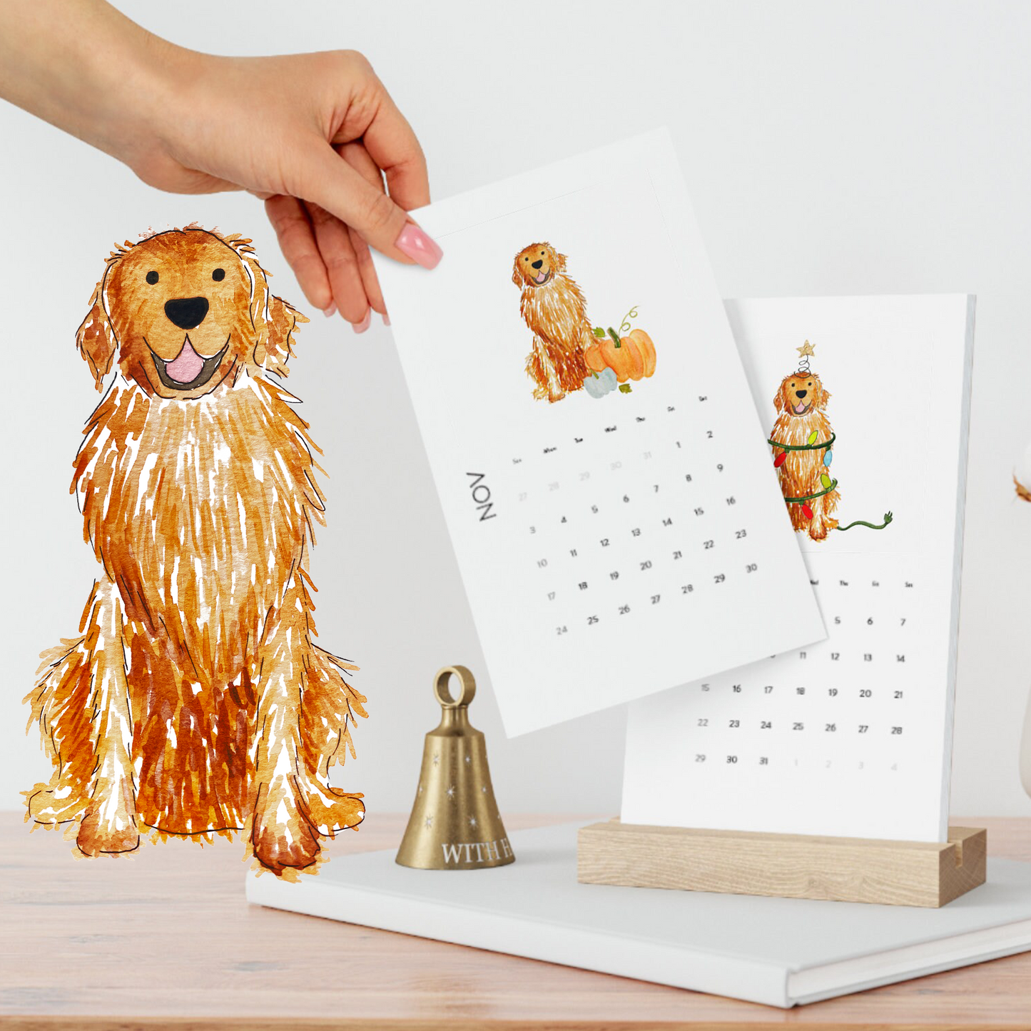 Celebrate everything 2024 has in store with this adorable Red Golden Retriever calendar tabletop calendar featuring fun, hand-painted art that changes every month.