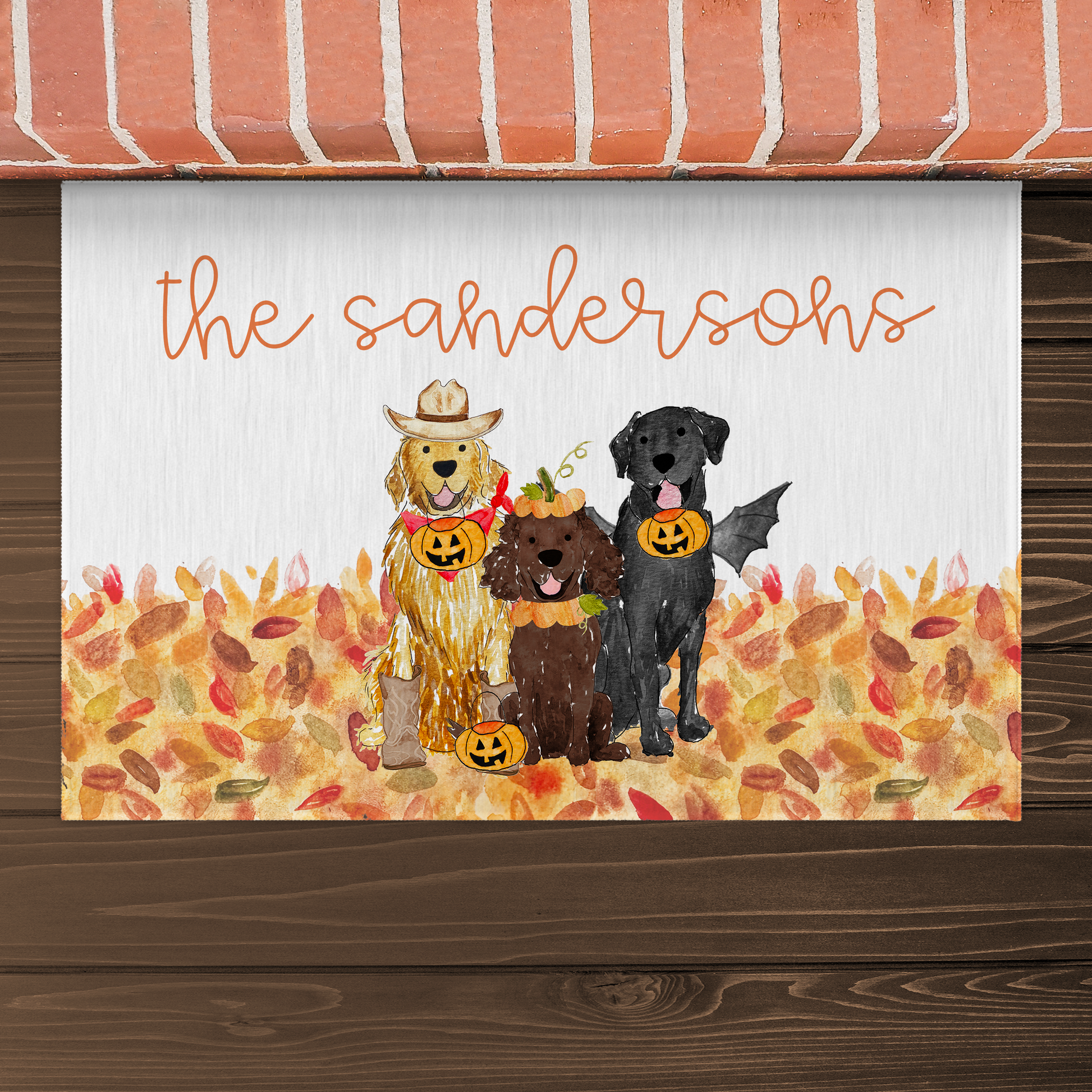 Greet guests with a hauntingly cute welcome mat rug this Halloween featuring your furry family! 🦇 🐶 Customize your entry rug with hand-painted watercolor art that match your adorable dogs and cats and get them ready to trick or treat with your choice of Halloween costume. This flag is ideal for adding a spooky touch to your porch! Plus, it's easy to swap out for whatever season (or spooky season!) you're feeling. Trick or treat yo'self! 😉