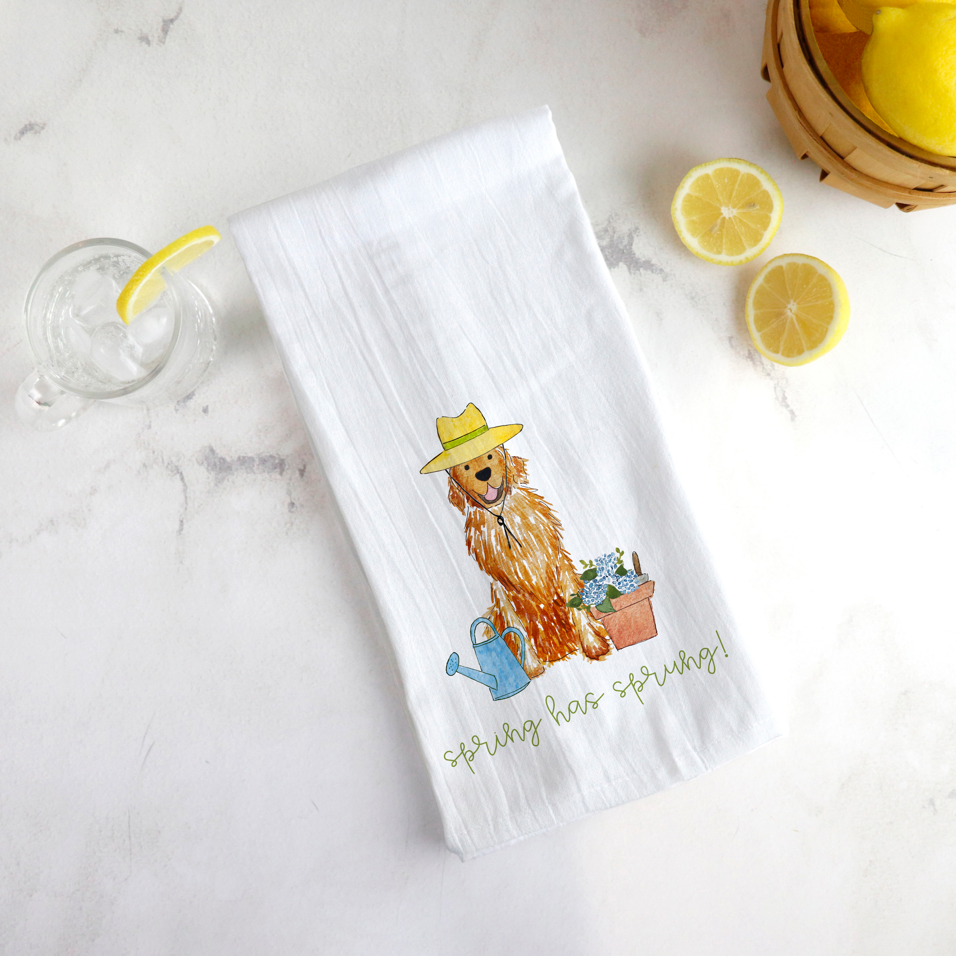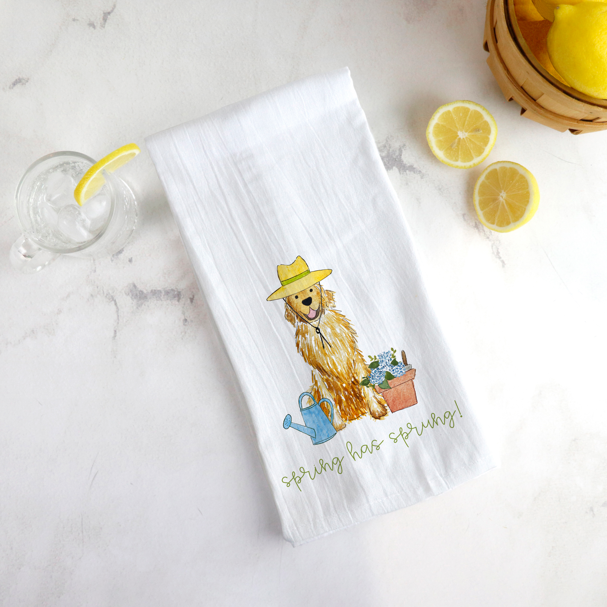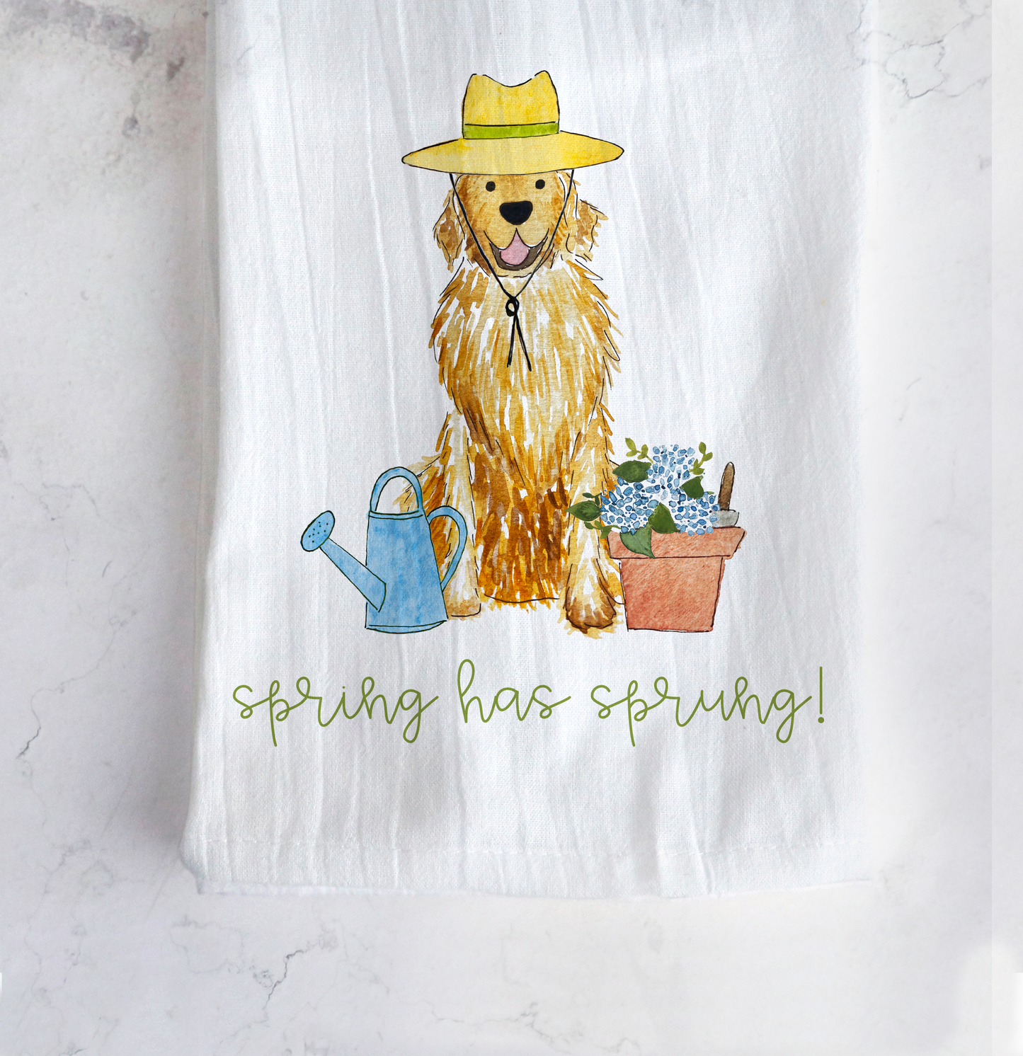 Spring has sprung! Celebrate the season in the garden with your Golden Retriever and this adorable tea towel!