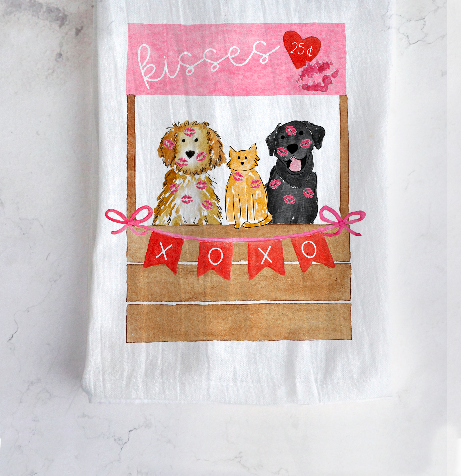Get your kitchens and bathrooms ready for Valentine's Day with a tea towel personalized with your furry family! Customize your towel with hand-painted watercolor art of your adorable pets and your choice of seasonal accessories. Personalize with 1-5 pets! The more the merrier!